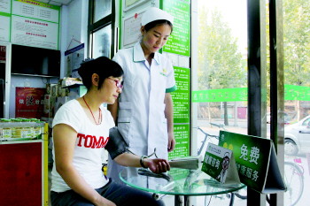 漱玉平民大药房的工作人员正在给市民体检。