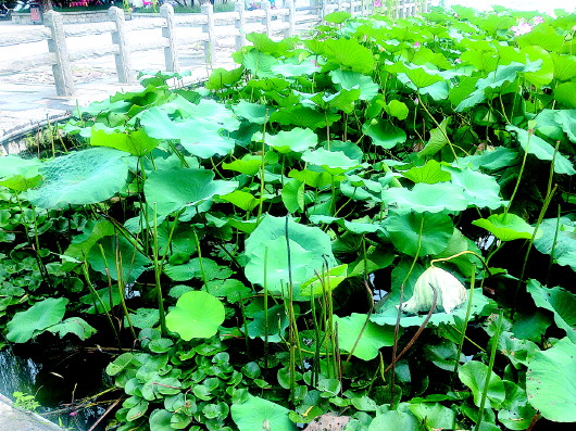 记者在大明湖景区其他荷池发现,许多其他品种的荷花也未能幸免。在景区另一处睡莲池中,也种植着王莲,上面浮着四片叶子。虽然此处王莲池没有被扔满硬币,但池中的水葫芦不知被哪位游客拔起,扔到王莲叶上。