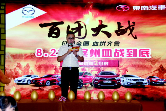 本报讯 22日,滨州车博士长安马自达百团大战、滨州血战到底团购大惠战在滨州白鹭湖举行,经过120分钟限时抢购完成了成交68台的喜人战绩。