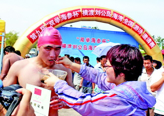 ▲2014年,双举海参在横渡刘公岛海湾全国游泳邀请赛现场为选手送上鲜美海参。(资料片)