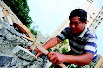 在张店西五路上一工地,工人在高温下作业(资料片)。