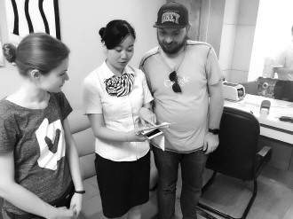 2015年8月16日,工商银行薛城支行营业室理财经理为外国友人介绍手机银行使用方法,热情周到的服务赢得了客户认可。 (颜海龙)