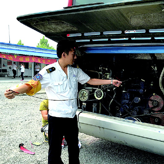 5时30分,赵晨已经赶到了车队。5时50分,赵晨围着公交车查看车况,先是掀开车盖检查油料和发动机,再查看轮胎,“灯光、刹车、油料、雨刷,都要挨着检查”。