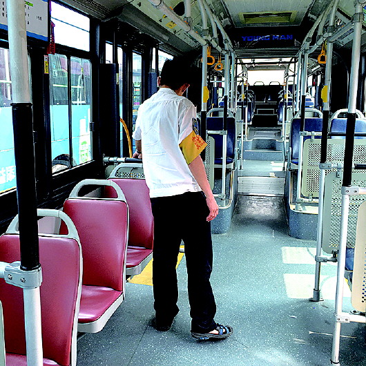 还有10分钟就要发车了,赵晨走进车里,这瞅瞅那看看。“犄角旮旯里都能藏进垃圾,卫生纸、雪糕棍、口香糖啊,得仔细查,不然发现不了。”赵晨说,前一晚收车时已经把垃圾打扫干净了,但早上发车之前还是要检查一下,公司里有稽查大队,经常不定期不定时地抽查车辆卫生。