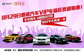 越盛夏越狂欢,山东吉通进口雷诺8月29日盛大开启雷诺汽车VIP专场·狂欢团购惠!全系大促,尽享豪礼盛宴!总经理特别批准特价现车10台,最高现金直降6万,再享5年或12万公里免费保养(工时+材料)。全系车型底价放送,零利润销售。专业的团队,盛大的抢购,直接的让利,不管您信不信,清库促销不用等年底。8月剁手季,吉通雷诺诚邀您共同见证此史无前例的价格风暴,此时不抢,更待何时?详询:0531-87292268!