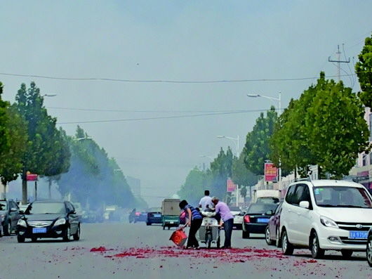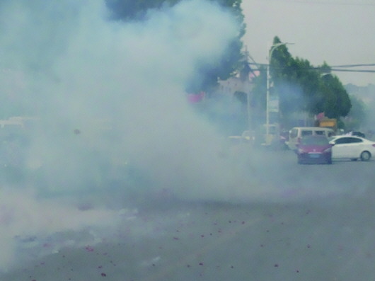 记者驾车从陇海路南端驶入,前进不足100米就被烟花爆竹挡住了去路,交通堵塞也随之形成。整条街烟雾弥漫,骑自行车及电动车的市民更是被熏得捂着口鼻往反方向行驶。