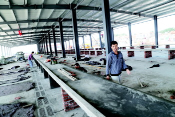 在东口码头记者看到,码头上原来狭窄的岸边如今已经变成宽敞的水泥路面,在原来的港湾停船位置,已经建成了两个高大的交易大棚。大棚里建设了很多个摊位,部分工人正在忙碌着进行收尾工作。在大棚的东面,几个工人正忙着搭建厕所,还有一些工人准备画停车位。