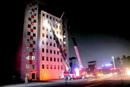 菏泽消防支队举行夜间高层建筑火灾跨区域实战拉动演练