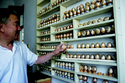 李爱民告诉记者,他从去年9月份着手雕刻开国元勋人像,用时9个月的时间雕刻完成,记者注意到,每一目录下的每一位大将的脸部轮廓明晰,微笑抑或严肃,表情细致鲜明。展架上的蛋雕是几经更换的结果。据李爱民的妹妹李鹏讲,每当有同一个人物更好的表情雕刻完成后,都会把之前展架上的替换掉。记者注意到,不同表情的毛主席雕像就不止20个。同时,李爱民卧室里还有另外一个展架,上面也放满了他近几年来所雕刻的蛋雕,足足有200余个。
