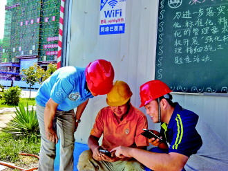 27日中午,润和花园项目部工地通道处,几位民工正利用午休时间连接WiFi上网,与家人视频、浏览网页新闻、看电视剧……架子工小宋是85后,闲暇时爱上网的他以前每月手机流量费需100元左右,自从工地通了免费WiFi,他每个月的手机流量费就省了。农民工孙波表示,以前晚上出去喝酒及打扑克的民工很多,自从通了WiFi后,大家一到下班点就待在宿舍上网,跟家里人视频,看电视剧,非常方便。另一位农民工则表示,等以后假期购票,工地有WiFi就更方便了,再也不用担心抢不到票了。