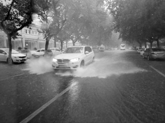 26日突降暴雨时,市中区龙头路上一辆车从积水中通过。(资料图)