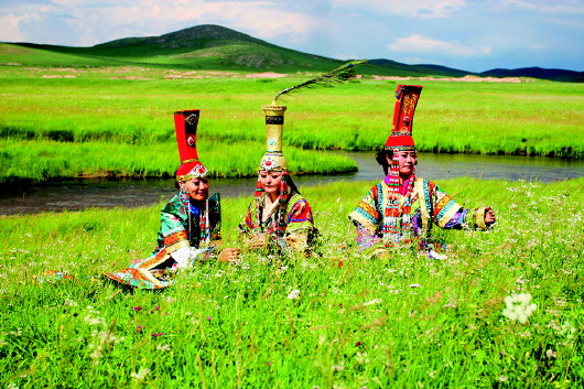 游客穿上蒙古族的民族服装在草原上合影留念。