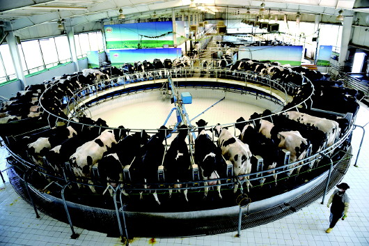 内蒙古伊利集团实业有限公司一厂区内,转盘式挤奶器正在运转。