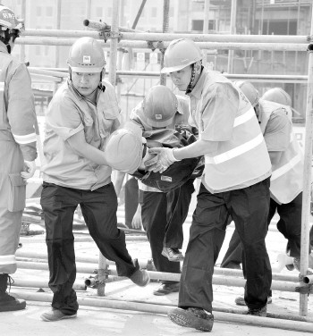 28日,济宁市建筑施工安全应急演练在大运河东片区回迁安置项目工地举行,演练模拟建筑施工脚手架坍塌后,6名职工被困,住建、安监、卫生、消防等部门开展联合救援,经过10多分钟的救援,被困人员全部救出。图为救援人员救出被困职工。 本报记者 公素云 摄