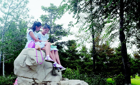 两位小朋友爬上一块大石头做起了作业,沐浴着微风,不亦乐乎?