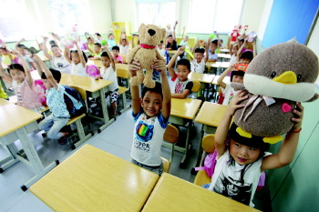 开学首日,在洮南路小学,刚刚入学的一年级新生带着最喜欢的玩具来到学校,以缓解紧张情绪。 本报记者 张晓鹏 摄影报道