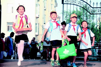 8月31日,威海市中小学生迎来开学第一天,学生们忙着领新书,调座位,迎接新学期。据了解,开学第一天市区各学校除了举办传统开学典礼外,学校还为学生们安排了形式多样的开学第一课。图为古寨小学学生们在家长的目送下开心地奔入校园。 记者 陈乃彰 摄