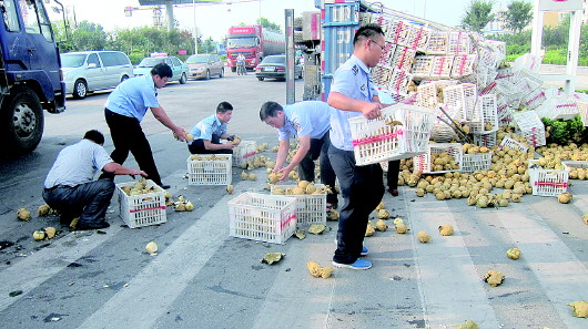 让他欣慰的是,围观的人群中有几个好心人帮他捡梨,有人提醒他拨打电话报了警。几分钟后,金乡县公安局缗城派出所7名民警赶到现场。“围观的人越来越多,我们害怕发生哄抢事件,边维持现场秩序,边帮着捡梨,装筐,搬运到路边。”民警说。