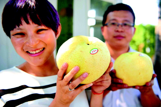 石慧芸夫妇种的梨一个足有5斤重,个头比成年人的脸都大。 本报记者 王媛 摄