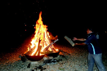 晚饭过后,岛上并不寂寞,早已为游客准备好的篝火晚会将海岛的夜空点亮。人们在熊熊的篝火下唱歌跳舞。当天晚上来自北京、威海、烟台等地的旅客竟然飙起了歌,你来我往,好不热闹。