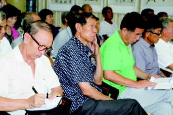 居民认真聆听机关医院专家讲述吸烟的危害。 本报记者 邵芳 摄