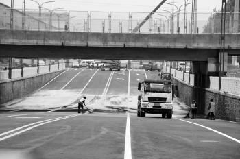 9月1日,天衢东路下穿京台高速桥涵处,工作人员正在清理路面积水形成的淤泥。道路原计划8月底开通,但由于连续降雨工期略受影响。 本报记者 马志勇 摄