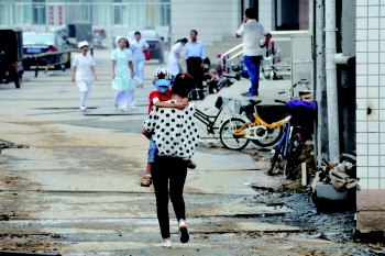 小嘉懿在医院输液结束后和母亲回家。 本报记者 王鸿哲 摄