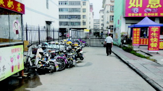 9月1日中午,记者在枣庄三中西校门口看到,在华西小区南门附近的确停放了一排电动车,门里门外都有。正好占据小区两扇大门的一扇,虽然大门都上了锁,居民从旁边侧门进出,但是居民们仍然很担心。“这是消防通道,要是真的着火了,消防车进不去那不就急死了,学生把车子放在这里碍事不说,也不安全啊。”一位居民担心地说道。