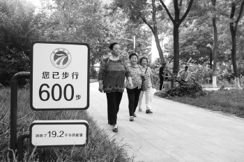 健康步道上醒目的标示牌吸引了前来锻炼健身市民的注意。