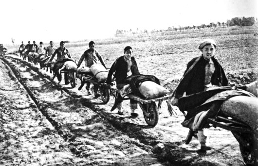 1945年春,山东群众配合八路军反攻作战运军粮。 (资料片)
