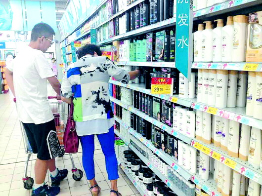 ◤市民正在超市挑选洗发水,不少洗发水都打无硅油牌。