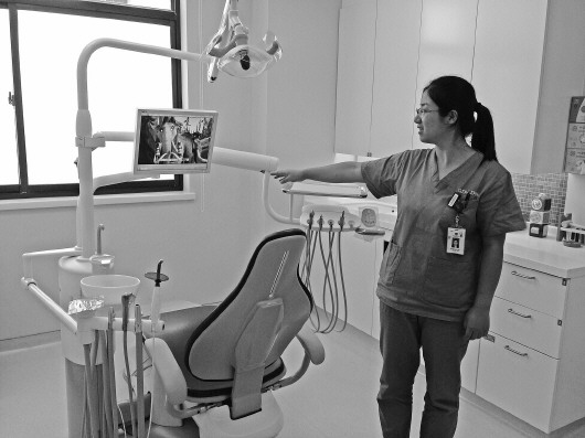 ◥8日,在青岛和睦家医院,口腔科诊室的设备上还配备有能播放动画片的屏幕。