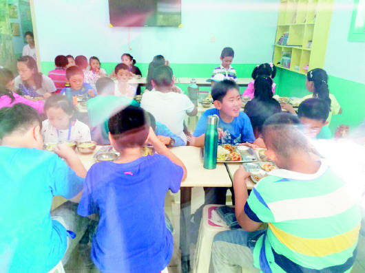 舜耕小学外,学生们在一家小饭桌用午餐。