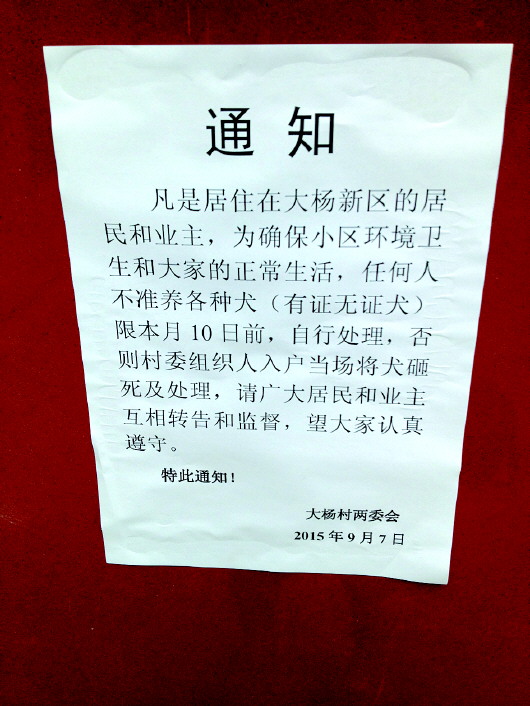 根据网友贴出的通知,记者注意到,该通知为大杨村两委会9月7日贴出,要求大杨新区的居民和业主“任何人不准养各种犬(有证无证犬)”,如在本月10日前还未自行处理,将由“村委组织人当场入户将犬砸死及处理”。值得注意的是,通知虽署名大杨村两委会,但并未加盖村委任何公章。
