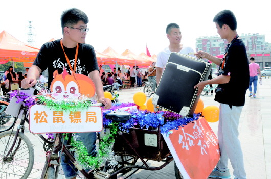 菏泽学院法律系大二学生郭中天是该系新生报道服务站的志愿者,8日一早,他就花了70元钱租了两辆三轮车,还特意用拉花和气球精心装饰一番,用来免费帮新生托运行李。“新生行李多,去宿舍的路也不熟悉,两辆三轮车已经拉了一上午行李了,我们这样做就是想让新生们在入学第一天感受到学长们的温暖。”另外,记者看到,郭中天还特意给自己的队伍起了个霸气的名字叫“松鼠镖局”。