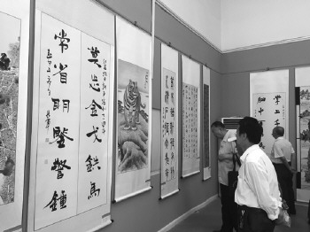 8日上午,由东昌府区委宣传部、东昌府区文联以及区总工会联合主办的聊城农商银行杯纪念中国人民抗日战争暨世界反法西斯战争胜利70周年书画展在聊城人民公园书画艺术展馆正式开展,本次共展出了向社会各界征集的书画280余幅,吸引了众多市民前来参展,本次书画展将持续到12日结束。