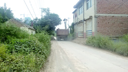 在大庙屯村,渣土车经过,扬尘四起。 本报记者 刘德峰 摄