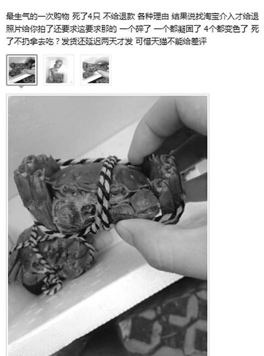 ▲一位消费者反映,网购“阳澄湖大闸蟹”没有蟹黄,而且是死蟹。