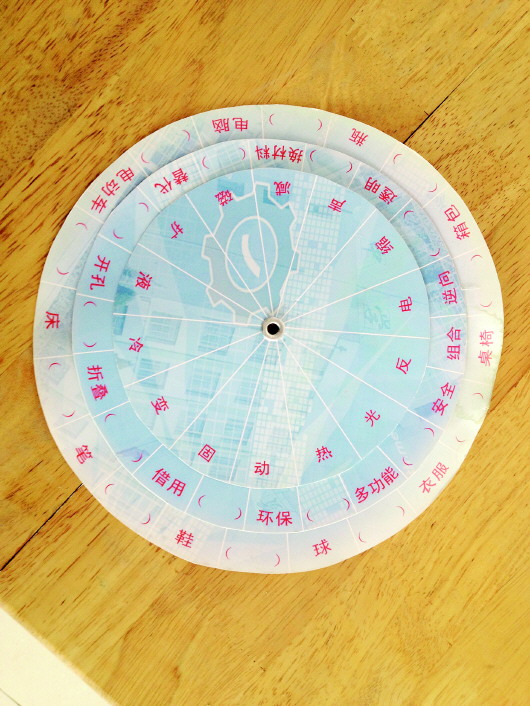 此外,他还自制了教具——创思魔盘。魔盘分为三层,最下一层写有鞋、笔、球、衣服等生活物品字样,第二层写有折叠、开孔、透明、换材料等字样,第三层则为热、光、固、声等字样。杨强说:“通过随机旋转魔盘,不同的物品在不同的状态、形态和操作下就会开辟出一个新事物。”