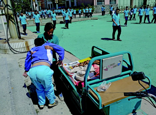 “每到放学时间,赵守杰的母亲就将电动三轮车停在操场,然后将赵守杰抱到轮椅上,推到台阶处,赵守杰再一步步挪到操场上,最后其母亲再把他抱到电动三轮车上,非常费劲。”赵守杰的班主任冯建宝说。