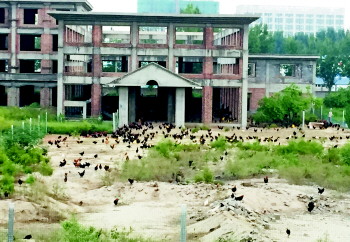 10日6时许,在惠和园小区内,记者便听到一阵高过一阵的鸡鸣声从院外传来。从12号楼二楼往北看去,只见与之一墙之隔的是一个在建工地,院子西侧长满荒草,几块地方开垦成了菜地;而东侧,密密麻麻聚集的便是“魔音”的始作俑者——数百只公鸡正在院子里打鸣、觅食。