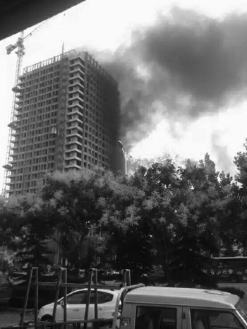 10日下午,有热心读者打来电话反映,在当天下午14点左右,和平路和建安路附近颐高国际商贸城内的一个在建楼盘内部起火,现场升起的浓烟升入百米空中,远在其他街区都能很明显地看到,目前尚不清楚失火原因和具体情况。记者随后赶到颐高国际商贸城附近,经过一番询问,发现之前冒起浓烟的正是在和平路和建安路交叉路口东南角一个在建楼盘。“当时冒得烟挺大的,有几十米高吧,不过没怎么看见火,就是只有烟。”旁边一位环卫女工告诉记者,冒烟的就是旁边的这座在建楼盘,一共大概冒烟三十分钟左右。当时消防车也赶来了,但是在不久之后就开走了。