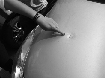 10日下午,记者来到潍城区鸿禧花园小区,在小区沿街一处房产中介公司门前,记者见到了王女士的爱车,车辆引擎盖上有一个明显的深坑。