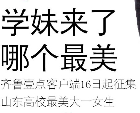 从9月16日起,本报将举办“学妹来了”山东高校最美大一新生评选,在齐鲁晚报客户端齐鲁壹点展示新一代大学生“青春、阳光、健康、自然”的形象,倡导健康向上的生活方式。