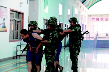 近日,武警潍坊支队开展防逃制逃专项演练,提高部队官兵处置突发事件的快速反应和应急处置能力,打牢全市监狱、看守所安全屏障。图为武警官兵荷枪实弹擒获企图逃跑的犯罪嫌疑人。