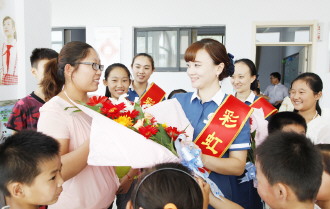 图为“彩虹天使”向聂庄小学的教师献上鲜花,送上节日的祝福。 (娄倩)