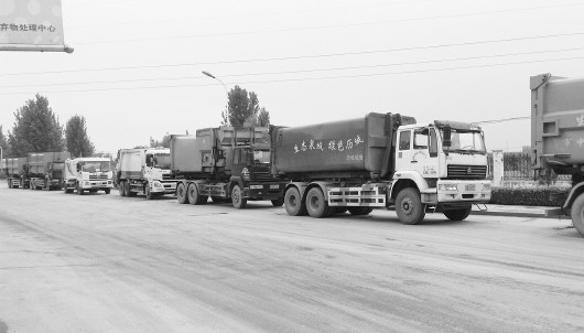 济阳垃圾处理厂重启后,在门口等候的垃圾转运车排起长队。由于济南市区每天产生的垃圾远远超过了处理厂的设计处理能力,处理厂一直在超负荷运转,而排队也成为了垃圾运转车每天都要面对的事情。(资料片) 本报记者 李阳 摄