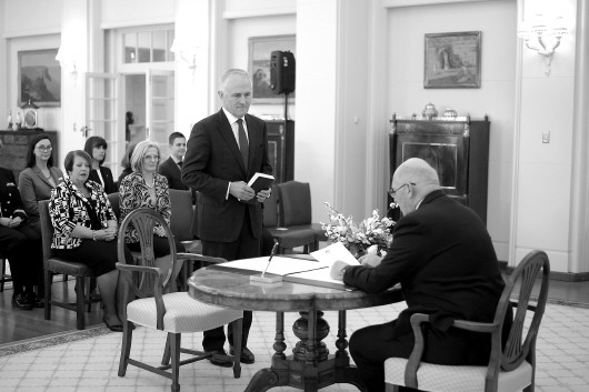 15日,在澳大利亚首都堪培拉,特恩布尔(前左)向总督科斯格罗夫(前右)宣誓就任总理。 新华/美联