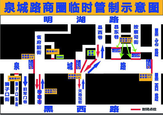 其中,泉城路(榜棚街至天地坛街)路段为无车区,该路段在19日5:00至20日19:00以及22日的9:00-19:00时段内禁止机动车通行。这就意味着,在指定的时段内,这一路段除公交车、出租车和执行紧急任务的特种车辆外,即便驻区车辆和摩托车也不能够通行。值得注意的是,这一措施针对的并非泉城路全路段,在泉城路县西巷至天地坛街路段还是允许驻区车辆穿行的。