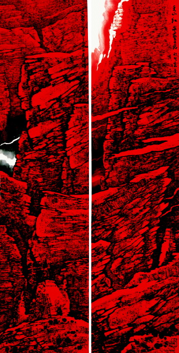 上个世纪90年代初开始,周尊圣深入新疆腹地,以西北“天山”为创作基地,体验生活,积累素材,走遍天山南北戈壁荒野,感受自然造化,对这里的风物进行了深入的探究,并以极富个人特色的“天山红”绘画语言表达对天山的感悟。他的山水画中以红色作为基调,用红色和墨色勾画,渲染出一幅幅顶天立地的山水画面,气势磅礴。而画面抢眼的中国红,裸露的山石,大漠中逆风而行的骆驼,在天际奔涌的滚滚浓云,雄浑、壮美,显然成了他画面的标志性符号,在业界产生了很大影响。